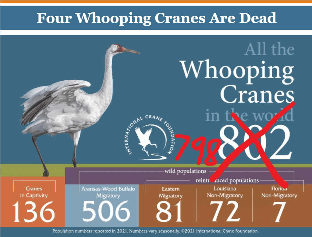 Graphic showing the total world population of Whooping Cranes – reflecting the recent shooting deaths of 4 of the Aransas-Wood Buffalo migratory population of Whooping Cranes while migrating through Oklahoma. Graphic courtesy of the International Crane Foundation