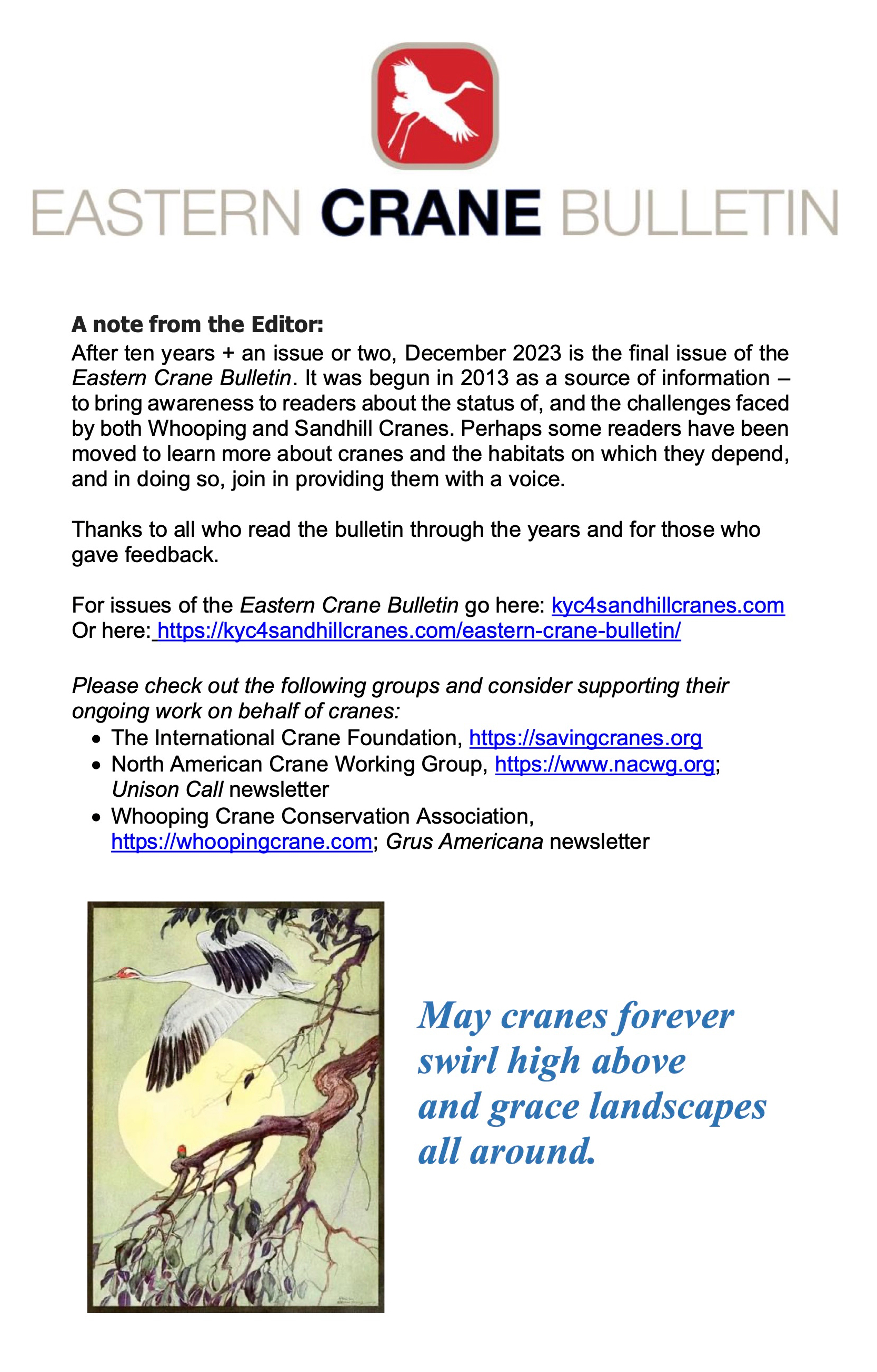 The following excerpts are from the March 2023 Eastern Crane Bulletin Avian flu outbreak and its impact on the endangered Whooping Crane?(page 37) “We’ve had our eye on this problem since the early 2000s,” said Dr. Barry Hartup, Veterinarian and ICF Director of Conservation Medicine. “We got particularly involved in this in 2005 when there was a massive outbreak of wild birds in China.” Cranes are among the most endangered bird families in the world, with 10 out of 15 species threatened. So, an outbreak of disease can be devastating to already fragile populations.