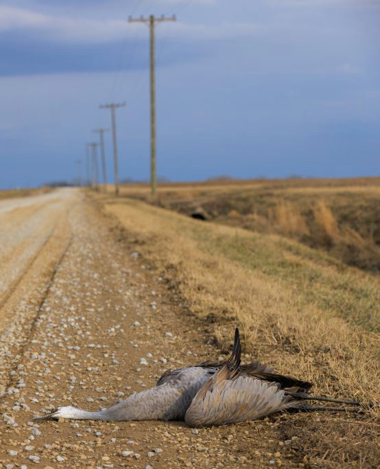 A dead Sandhill Crane lies along a road east of Goose Pond WMA on Wednesday, February 26, 2025 near Linton, Indiana. The Indiana DNR confirmed that as many as 1500 sandhill cranes have already died from the highly contagious HPAI H5 outbreak in Indiana. Photo by Jeremy Hogan/The Bloomingtonian